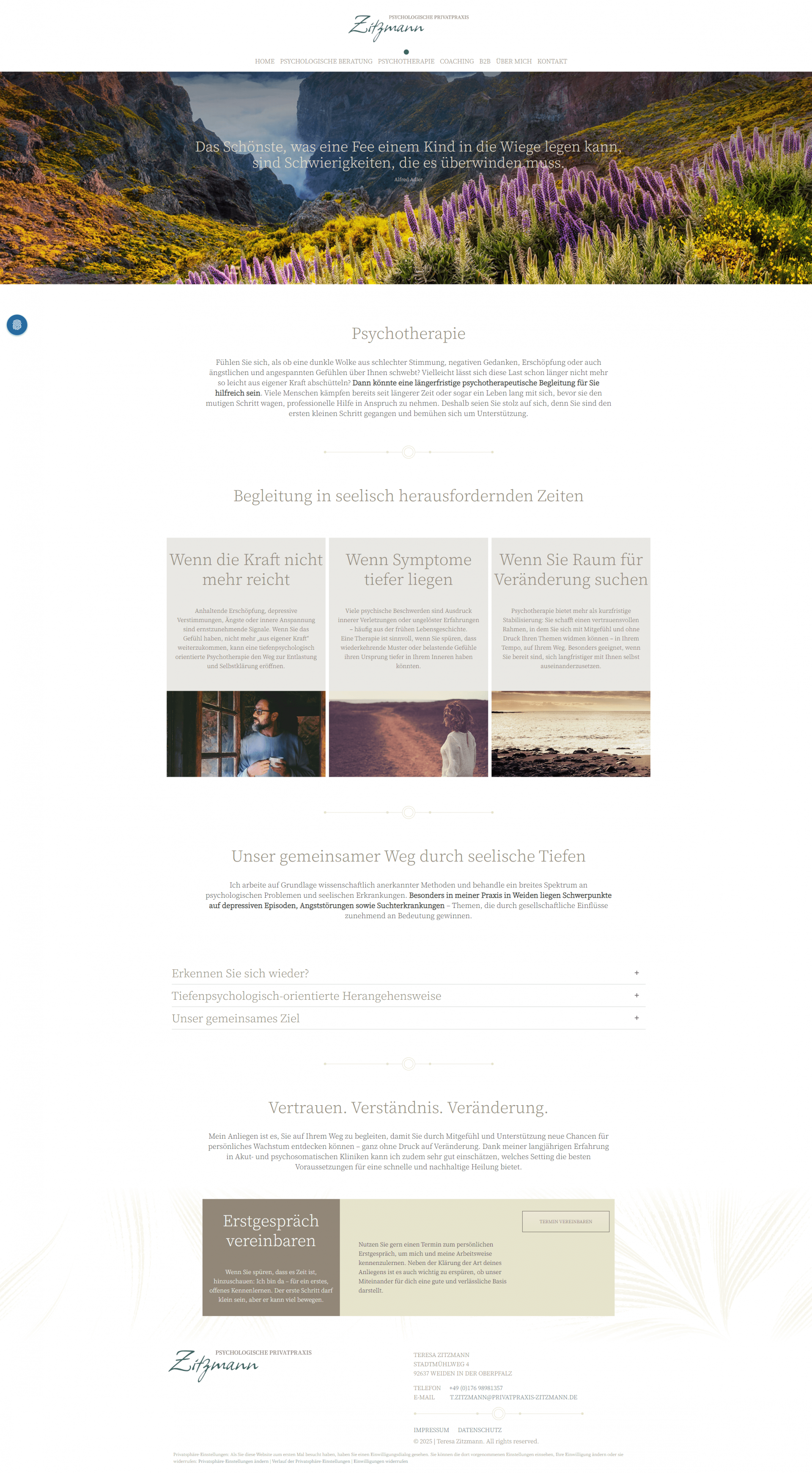 Dabei stand die emotionale Wirkung der Inhalte im Vordergrund: Texte und Bildwelten sind darauf ausgerichtet, Sicherheit und Offenheit zu vermitteln, Besucherinnen und Besucher unmittelbar anzusprechen und ein Gefühl von Geborgenheit zu erzeugen. Die Website ist bewusst so gestaltet, dass sie die Persönlichkeit von Frau Zitzmann authentisch widerspiegelt und ihre Haltung sowie Arbeitsweise klar kommuniziert.